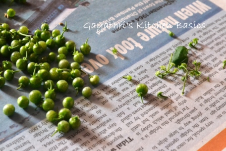 When I went to the garden I saw the manathakkali plant in full bloom. There were so many flowers, fruits and raw berries. My mom used to prepare puli kulambu with the berries. The greens are also used in dishes such as masiyal and poriyal. The plant has medicinal properties and the greens are used to treat mouth ulcers. I was very happy to see the berries and I at once brought a bowl and collected the berries. The berries in tamarind based gravy tastes absolutely delicious. The ripe berries can be relished as it is.