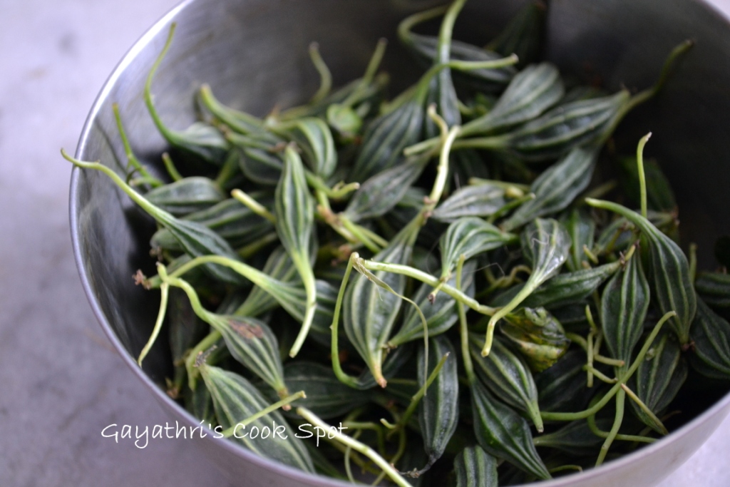 Preparing adhalaikkai is just like preparing tiny bitter gourds. Remove the tips on both ends and the vegetable is ready to be cooked.