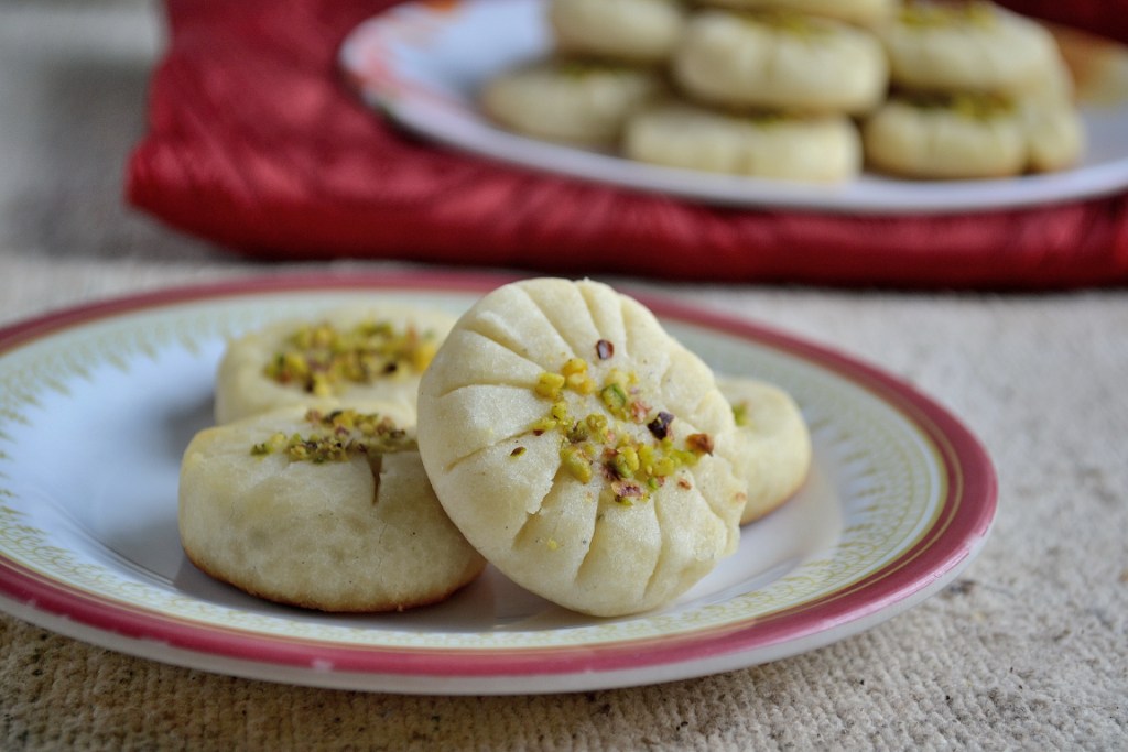 Recipe Adapted From Turmeric and Saffron Makes 3 dozen cookies Ingredients: For The Syrup: Sugar-3/4 cup Water-3/4 cup Lemon Juice-2 tsp Rose Essence-1/2 tsp Other Ingredients: Rice Flour-2 cups Milk-1/4 cup Butter-1/2 cup Oil-1/4 cup Cardamom Powder-1/2 tsp Vanilla Essence-1/4 tsp Pistachios-20-25 crushed for topping Procedure: 1. Add water and sugar and bring it to boil. 2. Reduce flame and let it boil until it comes to half a cup. 3. Add lemon juice and rose essence and allow it to cool completely. 4. Beat butter and oil until creamy. 5. Add the milk and vanilla and beat until incorporated. 6. Mix rice flour and cardamom powder. 7. Beat until well incorporated. 8. Add the sugar syrup and beat well. The dough will be sticky and thin. 9. Place it in a cling wrap and refrigerate for at least 6 hours. I kept it in the fridge overnight and baked them in the morning. 10. Preheat oven to 175C. 11. Pinch small portion of the dough and roll into a small ball. 12. Place it on a lined baking tray 2″ apart. 13. With a flat bowl, press each ball into a thick cookie. 14. With the help of a knife or fork make some designs on the top of the cookie. 15. Sprinkle crushed pistas on top. 16. Bake for 10-12 minutes or until the bottom of the cookie is golden. The top needs to be white. 17. Remove from oven and allow it to cool in the tray for 5 minutes. 18. Using a small spatula remove the cookies from the tray and allow it to cool. 19. Finish baking the remaining dough. 20. Store in airtight jar.