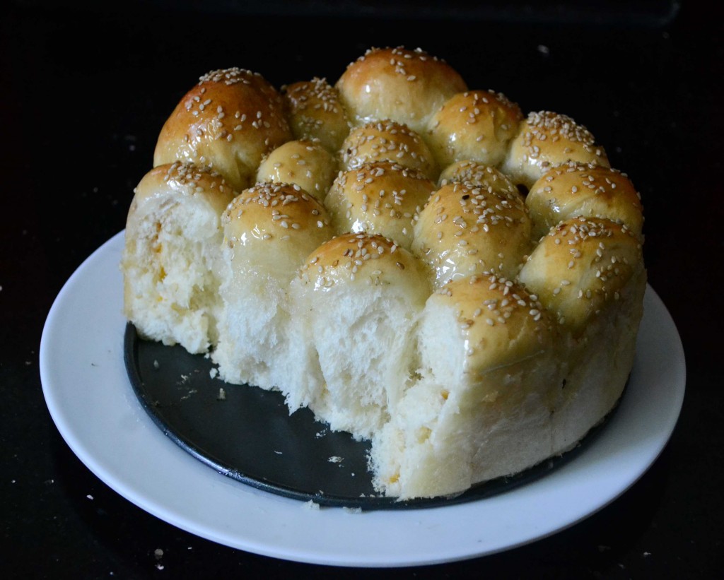 I have made Khaliat Al Nahal ( click on link for recipe) earlier. These are Arabic Pull Apart Rolls made to resemble the honey comb. Finally sugar syrup is poured on the rolls and it looks like the bee hive filled with honey. Usually these rolls are stuffed with cream cheese but the recipe I am posting today is filled with mango jam. I also made a video to demonstrate the making of the bread.