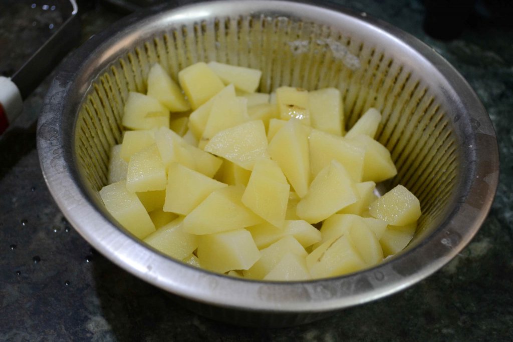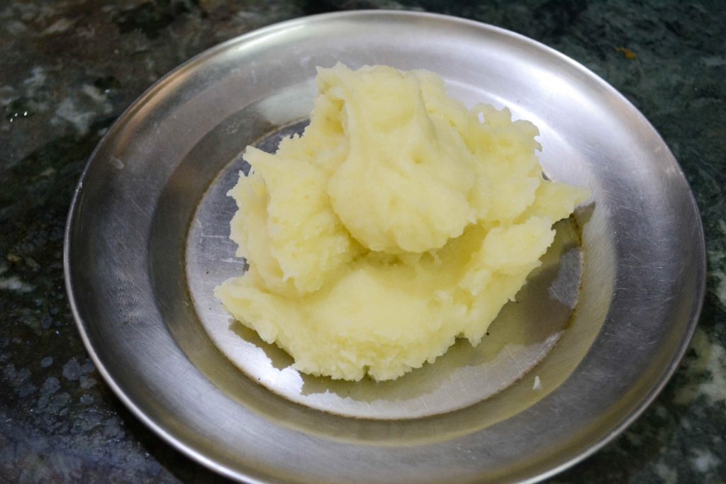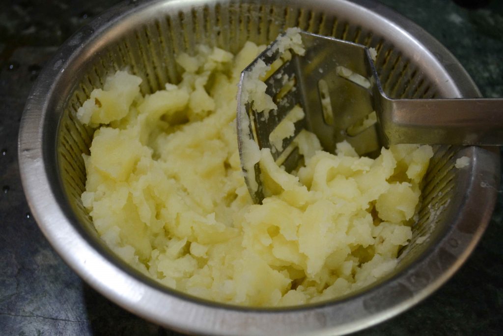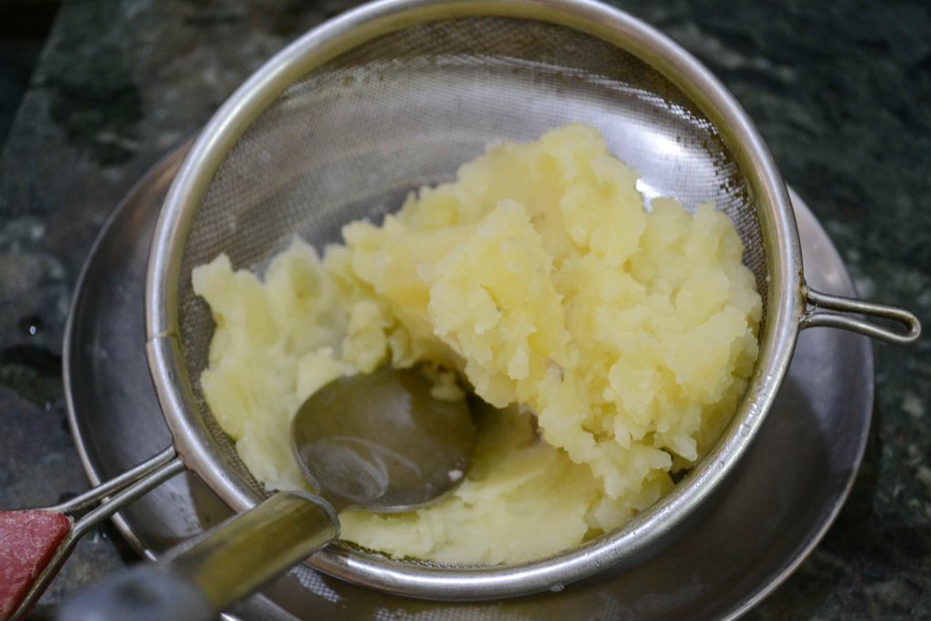 - Mash the potatoes and pass it through a metal sieve to get finely mashed potatoes. Measure it and set aside.