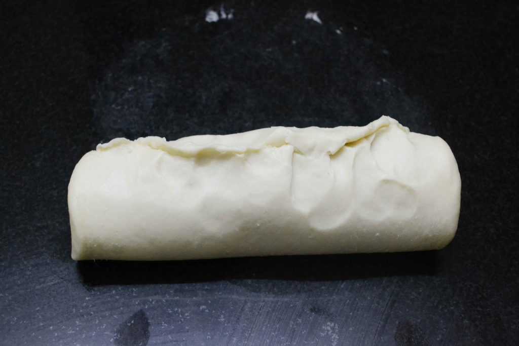 Once done, place it seam side down in a loaf pan, cover with cling wrap and set it aside for 2 – 4 hours until the dough touches the top.