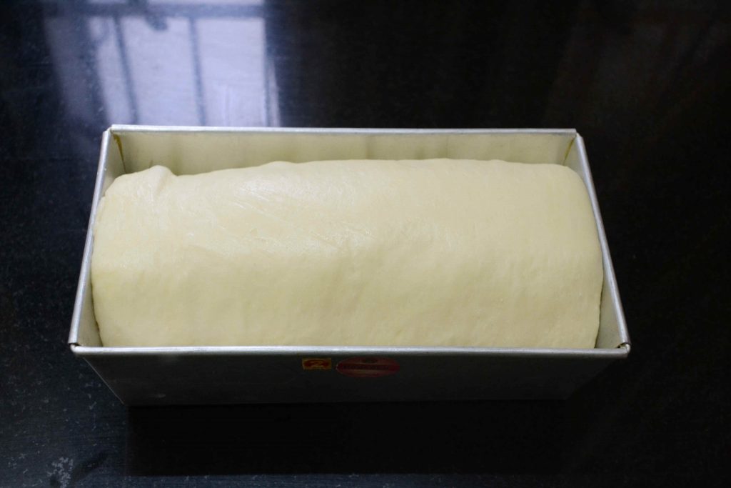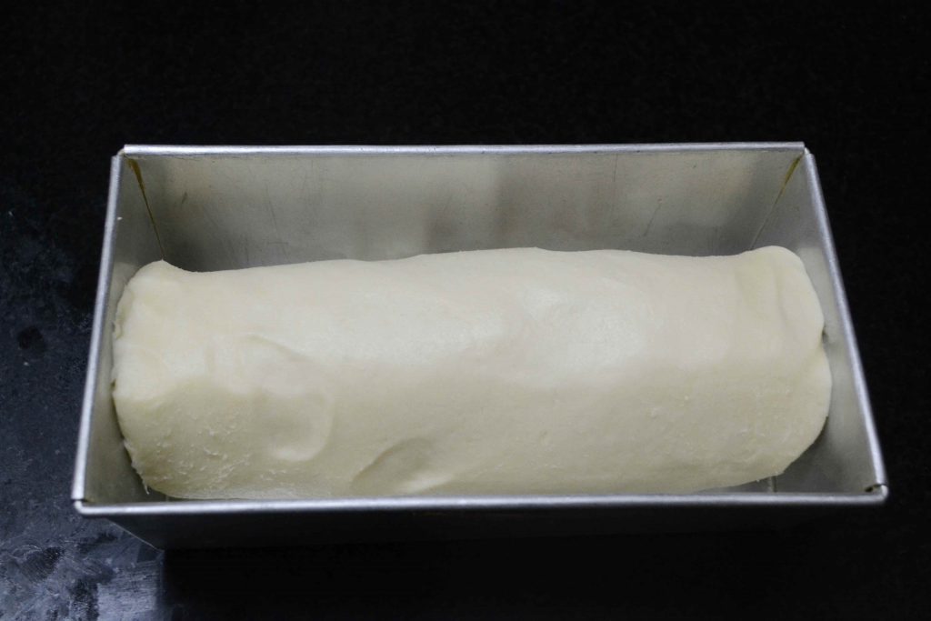 - Once done, place it seam side down in a loaf pan, cover with cling wrap and set it aside for 2 - 4 hours until the dough touches the top.