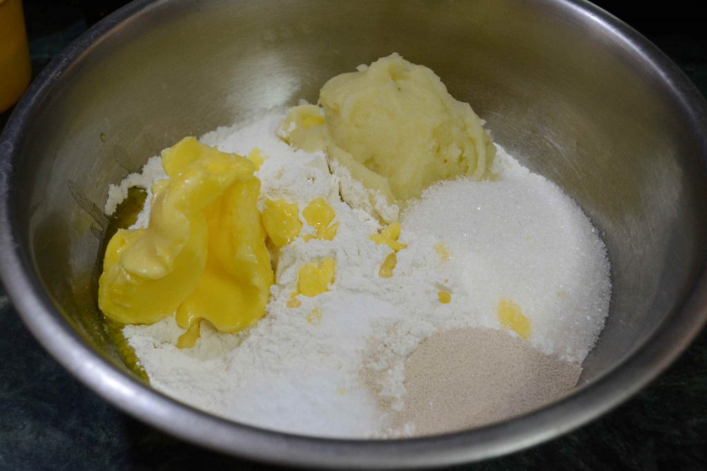 - In a bowl mix together flour, salt, sugar, yeast, butter and potato.