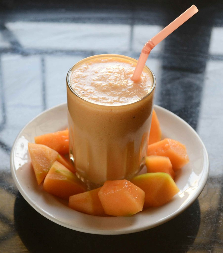 I love the taste of musk melon and we used to cube it, add sugar and serve it chilled. When I saw this at the fruit shop, I bought home one to make the above preparation. But then I started paleo diet and I didn’t want to add sugar to it. I was also not sure whether my daughter would like it as she is the only person who is having sugar at home. So I decided to make a smoothie instead. When I sliced the musk melon, I was surprised that it was not at all sweet.