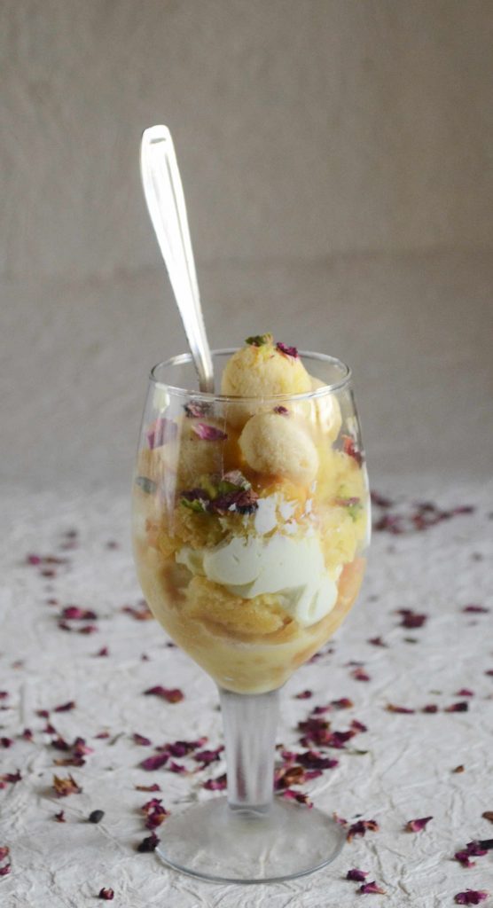 Recently I made a rasmalai cake (video coming very soon in my channel) and I had some rasmalai, cream and cake. That is what went into this dessert and Sruti loved it so much. Rasmalai is a famous Indian dessert made with spongy paneer balls soaked in a flavoured thick milk topped with pistachios. It is a delicious dessert and it used to be my favourtie when I was so much in love with sweets. Trust me, having a bowl of rasmalai in front and not eating needs a lot of determination, atleast for me. There is no particular recipe for the dish, but still I have written down what I did. I am sure you will like all the three dishes I am going to put this week. I even made a quick video on assembling it. It has been a long time since I made a FB video and here is my attempt. I hope you like it.