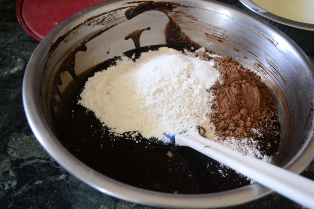 - To the same bowl add flour, cocoa powder, baking powder.
