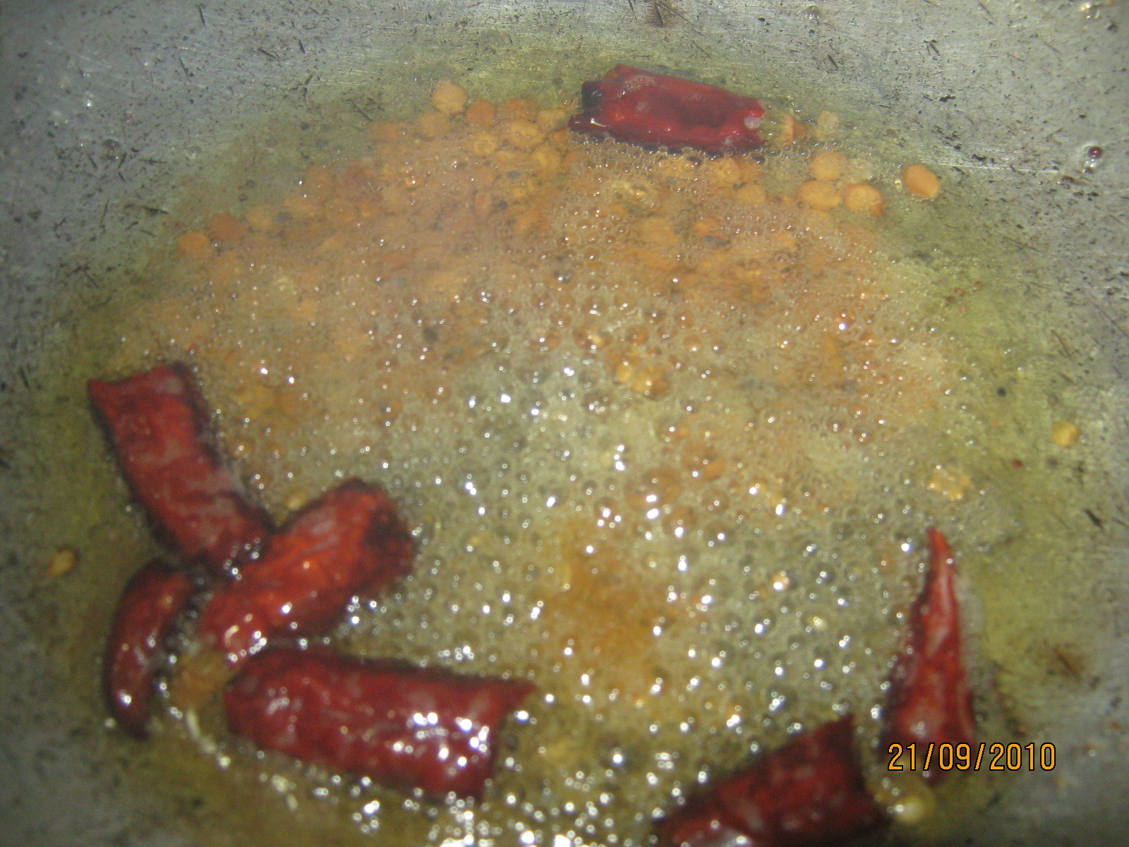 2. Heat oil and add channa dhal. When it becomes golden brown add mustard seeds, urad dhal, hing, turmeric powder, red chilly and curry leaves.