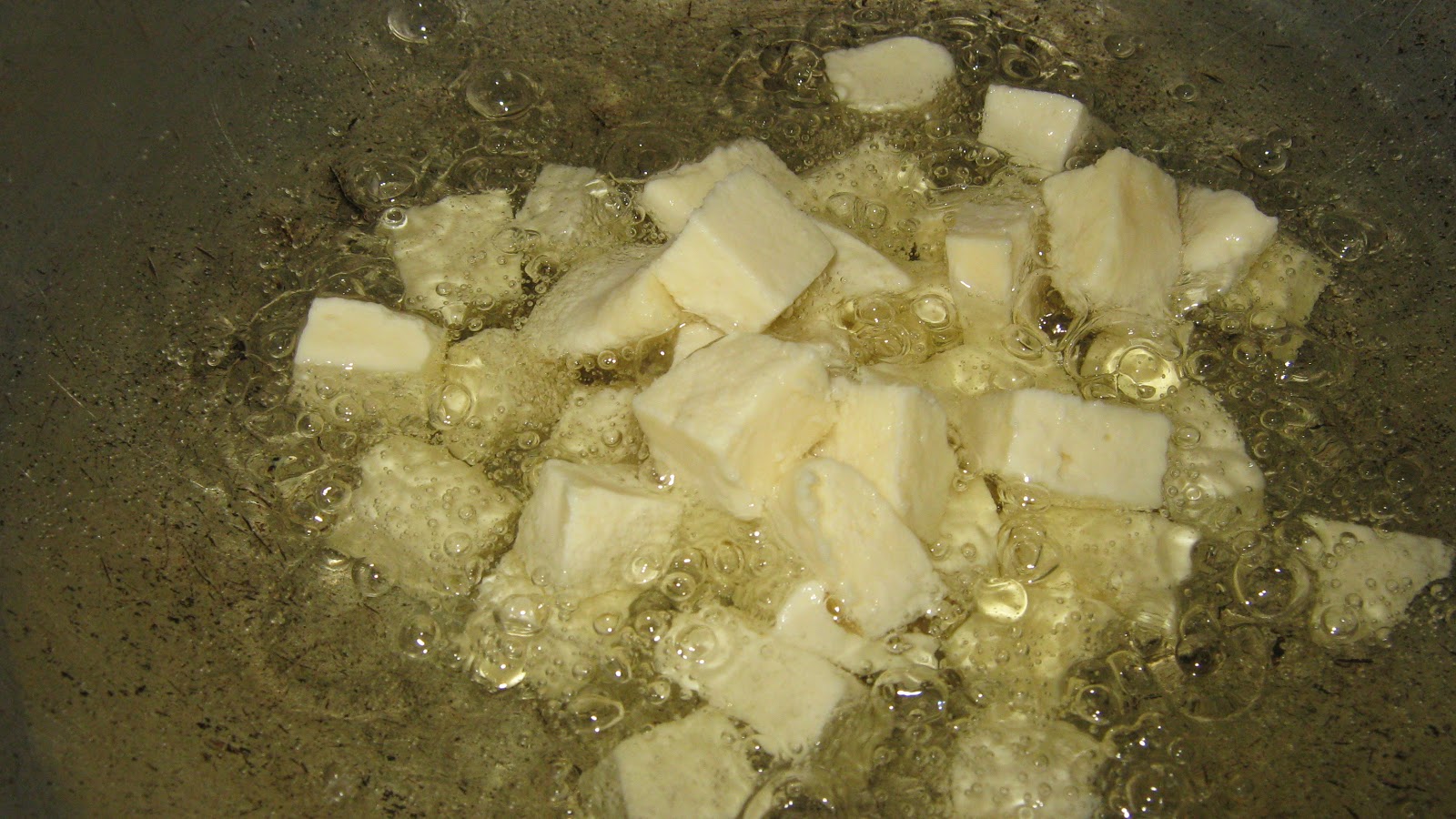 - Deep fry paneer in oil till glden brown. Remove from oil and drop them into water. This keeps paneer cubes soft.