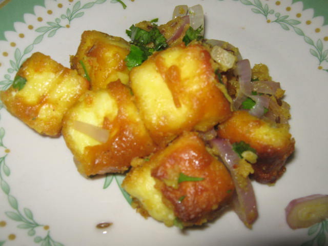 5. Heat 1 tbs oil and add the onion rings and the remaining masala paste and stir. When the mixture becomes dry add the grilled paneer cubes and stir for a minute. Garnish with coriander leaves.