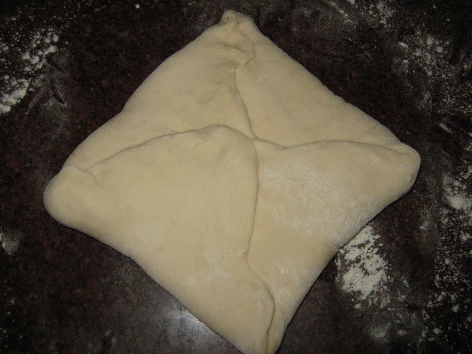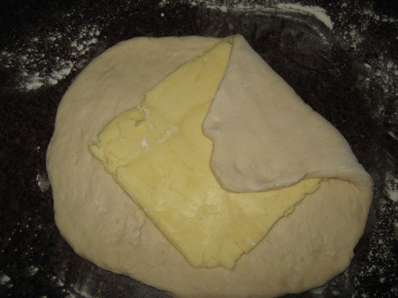 Shape the dough into a square. Place the butter as shown and fold the dough over butter.