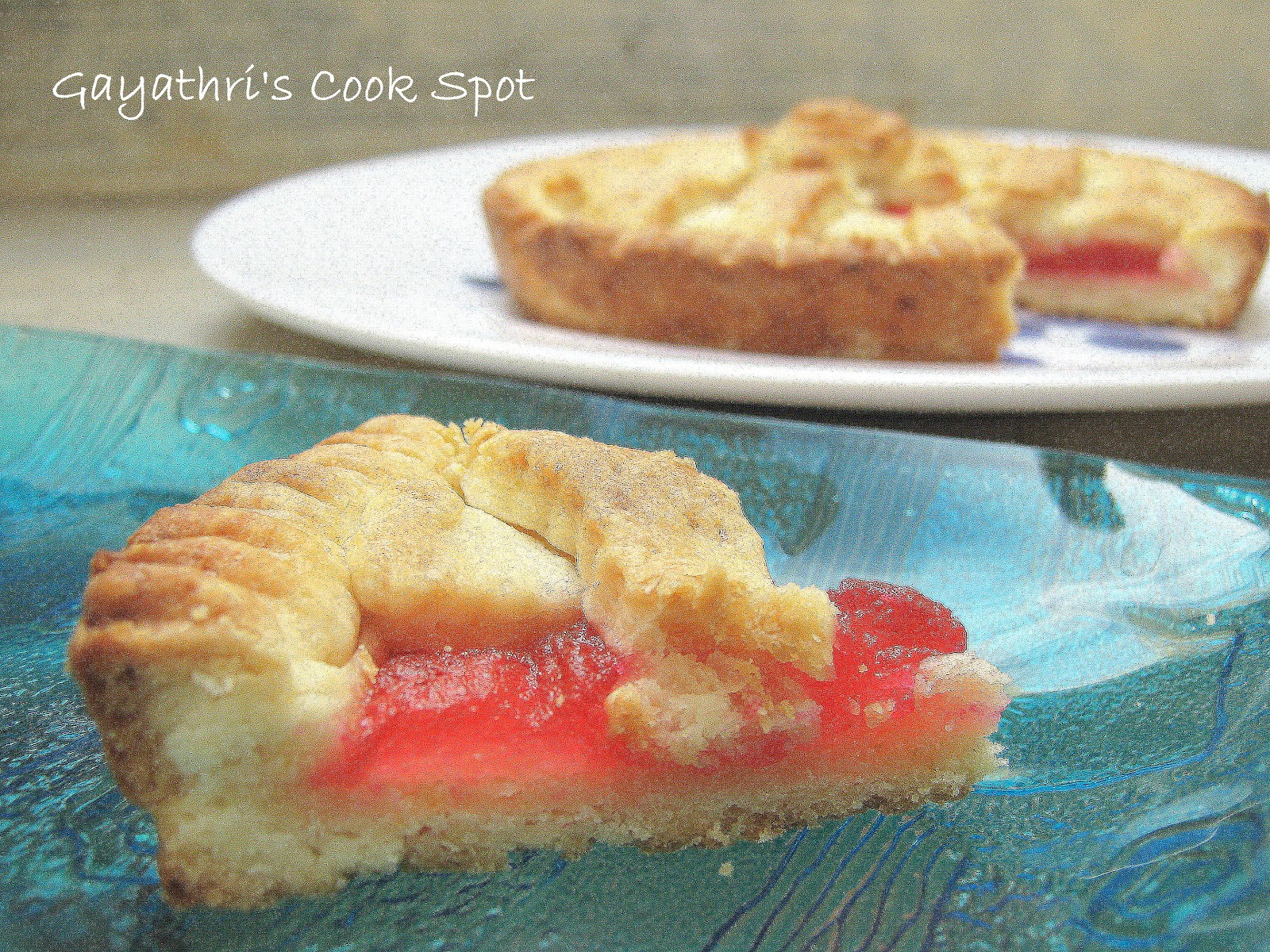 This is the first month I am participating in The Daring Baker’s Challenge. I was really thrilled. At the daring bakers Simona of Briciole challenged us with Pasta Frolla and Crostata. This was a very new recipe and I have never prepared pies or tarts. This was the first time I am trying a pie base and I had to prepare it eggless because I don’t use eggs in my dishes. I am extremely sorry about the length of the post. I couldn’t avoid it. As this is a different dish I had to explain in detail. For the whole month I have been browsing the net and watching videos of Crostata and I think I did a good job. Everyone liked it. I shared it with my neighbours also.It was crispy on top and little soft inside. It tastes good when served the next day( I read it in a blog)