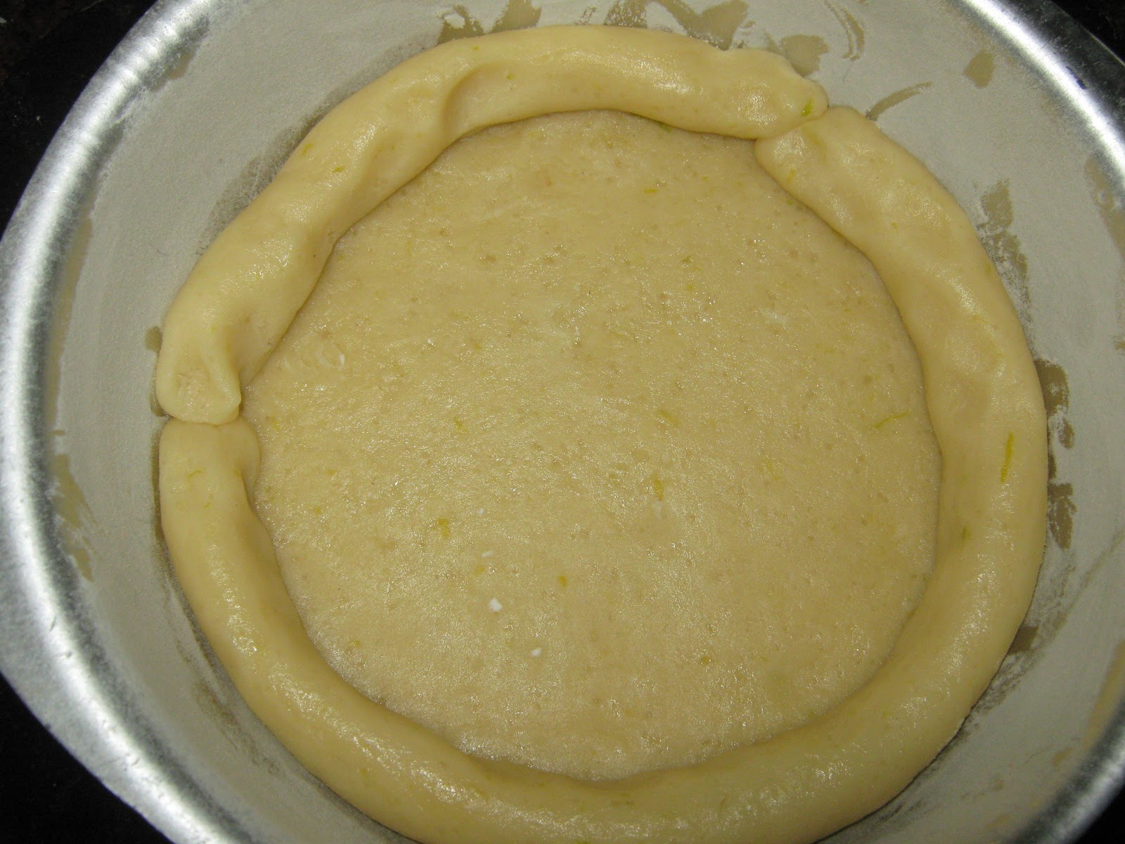 - Roll the remaining dough into a thin rope and place it on the circle inside the pan and along the edge.