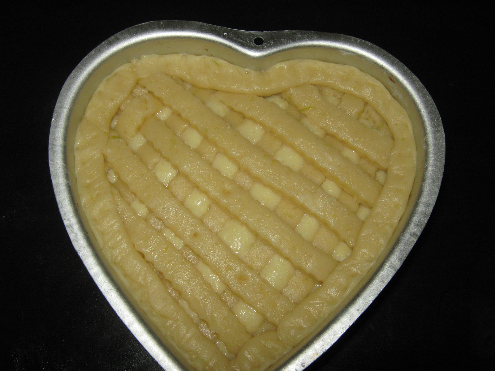 - Arrange the strips on the prepared pastry so that it resembles interlaced strips.
