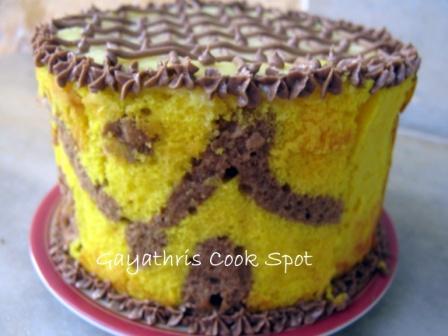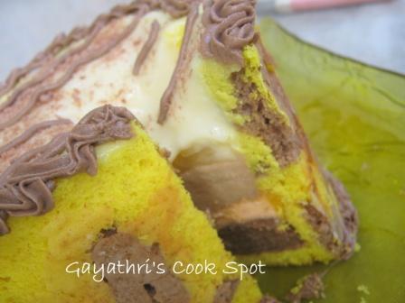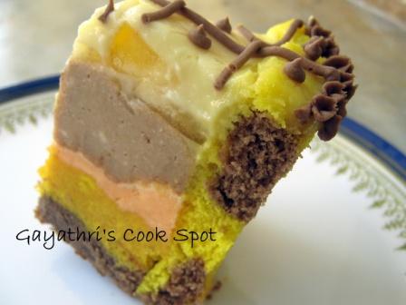 This month Astheroshe of accro challenged us with the French cake Biscuit Jaconde Imprime/Entremet. This was really a great challenge. A sponge sheet with a pattern baked on it is arranged inside the wall of the mold and is filled with interesting fillings. As I had to do an eggless version, I did a lot of experiments. At last I got a great Entremet. Though it doesn’t look very pretty, it tasted great. I had some guests and I was so happy to serve them with this yummy cake. Every one liked it. I even packed one for my friend’s son. With the given measurements I got two cakes. I am very sorry about the length of the post but I have to do this because I wanted to share my full experiment with you guys…