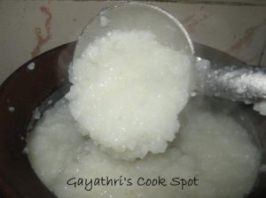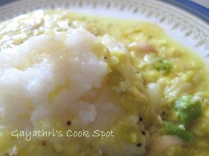 Procedure: 1. Heat water in a mud pot. When it starts boiling, transfer 3/4th of the water to another bowl. 2. Add washed and soaked rice and salt. Add a teaspoon of till oil to prevent the water from oozing out. 3. Cook rice till mushy. Add hot water at regular intervals. Cook on medium high flame. Stir it continuous to avoid burning of the bottom. 4. When cooked, cover and switch off flame. 5. Pressure cook mochai payaru with turmeric powder and a tsp of till oil for 15 minutes.(when the first whistle blows, switch flame to low and let it cook for 15 minutes ) 6. In a pan, heat oil and add mustard, urad dhal and curry leaves. 7. When splutters add onion and green chillies. Saute till translucent. 8. Add the cooked payaru. Add salt to taste. 9. When it boils add grated coconut and let it boil for one more minute. 10. Remove from flame and garnish with coriander leaves. 11. When serving, dip a ladle in water and take the rice with that ladle. This prevents sticking of the rice to ladle. 12. Pour some gravy to the side of rice. 13. Drizzle 1tbs ghee on the gravy. 14. Enjoy.