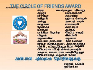 The Circle of Friends Award: First I should apologise to Jaleela for posting this very late. I have been awarded with the circle of friends award by Jalleela of Samayal Attakasangal. Her blog is very informative. Please visit her blog for the useful articles. Thank You Jalleela Akka!