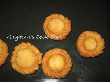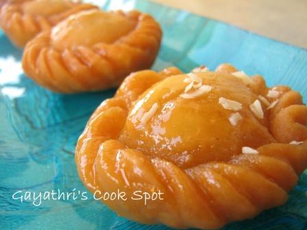 When Jayashri announced Blogger Marathon with Raks Kitchen for this fortnight, I remembered the badushah recipe I saw there. Badushah is my favourite sweet from childhood days. When I started cooking, I wanted to prepare it at home. Some recipes I tried didn’t give the expected result. When I saw the photos in Raji’s blog, I wanted to try it. Now I got a chance to try. It came out so nice. Raji has also included two you tube videos demonstrating the method of spiralling the edges. It was very useful. I have included some pictures demonstrating the method. I followed Raji’s recipe exactly except for the syrup. I have a book in which the badushas are dipped twice in the syrup. I followed that method which I will explain in the procedure part. I am sending this as an entry to Jayashri’s event Blogger’s Marathon