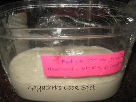 Procedure: 1. On the first day, mix 1/4cup water and 1/4cup wheat flour in a bowl. Mix it to a smooth paste and cover with cling wrap. Keep it aside for 12 hours. 2. After 12 hours you will see bubbles in the mix. Mix it vigorously with a spoon. Add 1/4cup water and 1/4cup wheat flour and mix it till smooth.( If there are no bubbles, just give a rigorous mix and cover with cling wrap and allow it for another 12 hours. If even after 24 hours there are no bubbles then discard it and start new.)Adding water and flour is called as feeding the starter. The starting of sour dough starter is with wheat flour. But after 4 feedings, switch to APF. 3. Cover with cling wrap and keep it aside for 12 hours. During the second feed, discard half the starter and add water and flour to the remaining mixture. 4. Do not feel sad for discarding the starter, because if you don’t discard then you will fill a swimming pool with the starter in 10 days. 5. So every 12 hours, discard half the starter and feed the remaining. 6. From 5th feed use APF and water. 7. From day 4, your starter will be ready any time. After feeding if the starter dough rises to double within 1-3hours, then your starter is ready. 8. You can use it in any recipe which calls for starter. Use it when it rises to double the size after feeding. 9. If you are goning to use the starter after 1 week, then you can refrigerate the starter after feeding it. Cover the starter in a bowl with wrap. Make some holes for the gas to escape. Refrigerate for 1 week. You have to feed the refrigerated starter after 1 week.