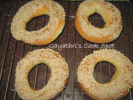 Procedure: 1. Mix all the ingredients to prepare a dense dough. If the water is not enough add a tbs extra water to bring the flour together. 2. Knead it for 10minutes on the counter till the dough is soft and elastic. 3. Cover the bowl with dough with a wrap and keep it aside for 2 hours. As this dough is very dense, it will hardly rise. Do not panic. That is what happens. When you press the dough with your finger, the dough should not spring back. Then it is ready for the shaping. 4. As it does not rise, you don’t have to punch the dough. 5. Divide the dough into 4 equal parts. 6. Roll each part into a 10″ long rope. 7. Bring both ends together below your palm. 8. Roll to seal the edges. 9. Shape all the 4 bagels. 10. Place on a greased tray, cover with wrap and refrigerate overnight. 11. In the morning, boil water in a wide pot. 12. Drop the bagel, one at a time. 13. It will immerse, stay there for 15-20seconds and then will come to the top. 14. Let it boil for 1 minute. 15. Flip and let the other side cook for 1 minute. 16. Take sesame seeds on a plate. 17. Take the bagel from boiling water and place the top side of the bagel on the seeds. 18. Grease a tray and place the topped bagel on the tray. 19. Repeat this for all the bagels. 20. Preheat oven to 250C. 21. Bake the bagels for 20minutes or till the crust is golden brown. 22. Cool on wire rack and enjoy.