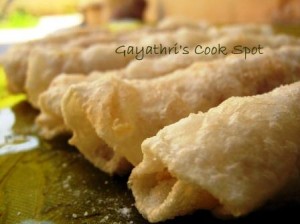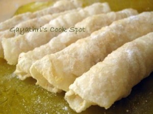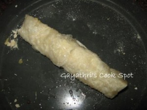 13. Place 3tbs of filling along one side of papad and roll it fast.
