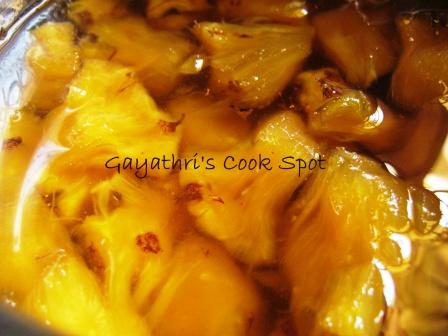 The ratio is 3:2:1(Pineallpe:Sugar:Water). Remove the skin of pineapple and cut them into thick slices. Weigh it after slicing. Boil water and sugar. Stir it until sugar dissolves and the syrup becomes clear. Add the pineapple pieces and cover the pan with a lid. Let it boil on medium flame for 30 minutes or until the pineapple slices are tender. Remove from flame and allow it to cool. Transfer contents to a sterilized jar and close it with a lid. You can refrigerate this for 3months. But I am sure it will not last that long because it is very tasty.