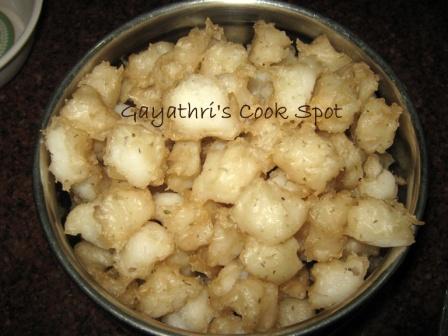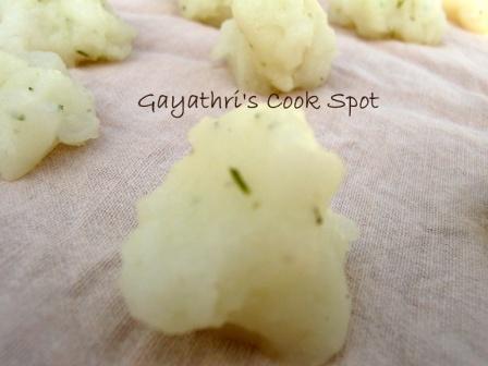Procedure: 1. Wash and soak parboiled rice for 3 hours. 2. Grind the soaked rice in wet grinder to a fine batter. 3. Grind green chillies and asafoetida in mixer grinder to a fine paste. 4. Add this paste to the batter and add salt. 5. Measure the quantity of the batter. For 1 cup of batter you need 3cups of water. 6. Boil the measured water in a wide deep pan. 7. When water starts boiling, transfer half the water to another bowl. 8. Switch flame to low and add the batter to the boiling water, stirring vigorously. 9. The batter will cook within seconds and it will come to dough consistency. 10. Add the reserved water 1/2cup at a time and stir well. Switch the flame to medium. 11. Gradually add all the reserved water and allow the dough to cook. After adding water, the dough will come to a semi solid consistency. 12. Cover and cook for 10minutes, stirring it often to avoid burning. 13. Once it is completely cooked switch off lame and cover the pan. At first the dough may seem so watery, but once it cools it will come to the required consistency. 14. Let it sit overnight. 15. The next day, in your terrace, spread a clean cotton cloth. 16. Knead the dough(it will be slightly sticky and it may have some lumps) to make it smooth. 17. Pinch small portions and place it on the cloth. You don’t have to make it a ball 18. Repeat till you finish with all the dough. 19. Let it dry in sun the whole day. 20. By evening, try removing the vadagam from the cloth. If it sticks, then it is not ready. 21. Bring it inside your home and fold the cloth and keep it covered overnight. 22. The next day, again spread the cloth in the terrace. 23. If your area is hot, then it would have surely dried. 24. Sprinkle water on the back side of the cloth and gently remove all the vadagams from the cloth. Store in a box. 25. The next day, dry the vadagams by spreading them on large plated(thambalam) and keeping them in terrace. 26. Once it is completely dry store in airtight container until further use. 27. When needed, heat oil and fry the vadagams and enjoy with rice.