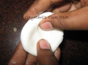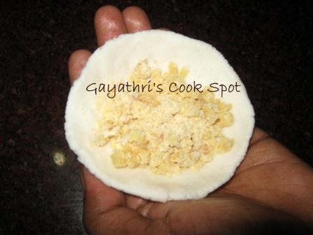 11. Keep 1 or 2 tbs of the filling in the centre and fold the circle over to form a half moon shape.