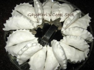 12. Press edges together to seal. Pinch along the edge of the kozhukkattai to for design as shown in photo tutorial. 13. Arrange them on a greased idli plate and steam cook for 10minutes. 14. Remove from pan and allow to cool. 15. Serve.