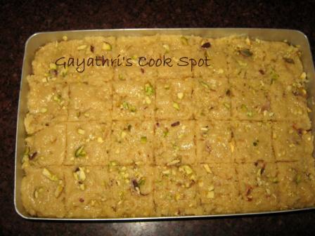 Procedure: 1. Mix milk and milk powder in a heavy bottomed pan. 2. Place on stove and stir it to avoid burning. 3. This mixture will start boiling. Switch flame to medium and stir it until the mixture becomes thick(Batter Consistency). This will take around 25 minutes. 4. In another heavy bottomed pan, melt butter. When the butter has melted, add the milk mixture. 5. When the butter is fully incorporated, add cardamom powder and sugar. 6. Stir it continuously. 7. Grease a tray with ghee. 8. When the mixture leaves the sides of the pan, pour it into the tray and level the top with the back of a spoon. 9. Sprinkle sliced pistas on top. 10. Allow it to cool for half an hour. With a knife mark lines on top to the required shape. 11. Place in fridge to set for 1 hour. 12. Cut along the marked line with a sharp knife. 13. Remove gently from the tray and serve.
