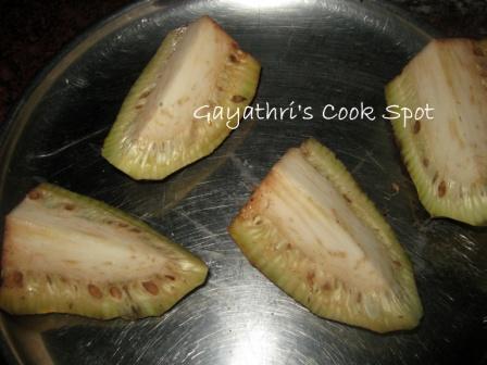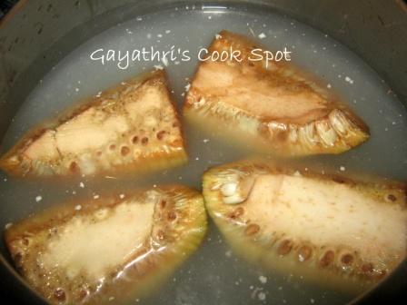 4. When a knife inserted goes smooth into the pieces, the baby jack fruit is done.