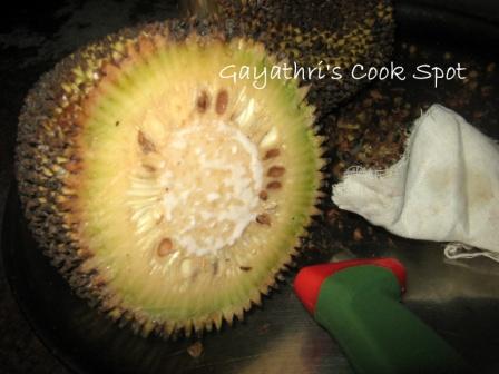 It is really an interesting process. You can use a sharp knife but I am comfortable with aruvalmanai (an instrument used in cutting vegetables in South India). As the skin is tough to cut, it needs some strength to cut jack fruit. Keep a white cloth dipped in till oil handy. The resin from the fruit will make the blade sticky. Wipe the resin with the cloth and the stickyness is gone forever. Even your hands will become messy. Take a tsp of till oil and apply it all over your palms. Leave it for a minute and wash with a soap. The mess will be gone.