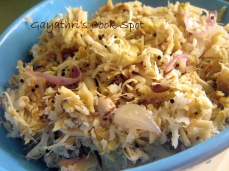 When we lived in Theni, the street vendors would bring Palapodi(grated Baby Jack Fruit). My mom used to prepare it often. I have tasted it but never bothered to ask about the preparation. In Madurai the vendors don’t sell grated baby jack fruit. So it is necessary that we prepare it.