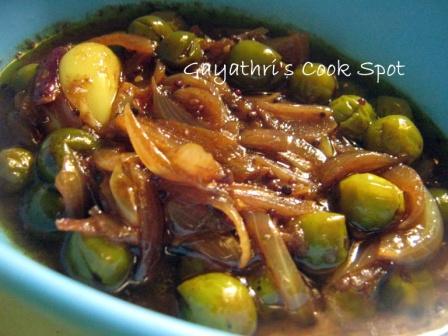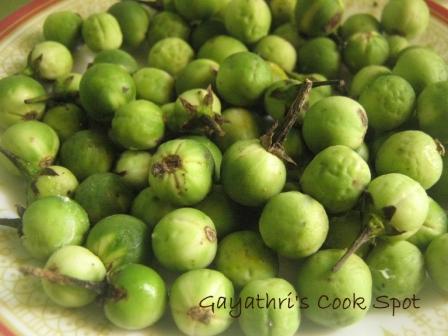Sundaikkai or Turkey Berries are usually relished as vatrals. The fresh berries are usually used in gravies. It has a bitter taste, so it is usually paired with lots of onion and sesame oil. Sesame oil helps to reduce bitterness of vegetables in gravies. Tamarind is also used to reduce the bitter taste. This kulambu goes very well with appalam and rice.
