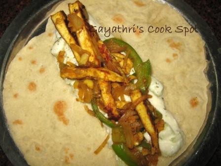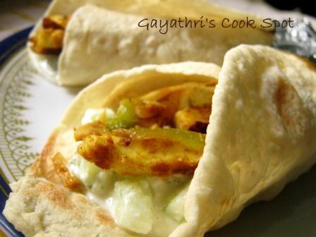 I am late in posting May month’s 4 Velveteers challenge. Asha of Fork Spoon Knife asked the members to prepare Greek Gyro.This is a famous Greek street food . The pronunciation varies from place to place. Syrians call pronounce it as Gear-O, some ethnic groups pronounce it as Yee-Row and Americans call it as Ji-Row. Whatever may be the pronunciation, the dish is so delicious. Usually meat is used as the filling for this sandwich. I prepared a spicy filling with paneer and capsicum. The sauce prepared with cucumber was fantastic. Yesterday we had a nice time. My hubby liked it so much. Thanks to Asha for introducing such a delicious dish.