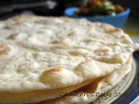 Procedure: 1. Mix all the ingredients except oil. Form a soft dough. 2. Now drizle oil and knead it until the dough absorbs the oil. 3. Place it n a bowl and cover with cling wrap and set it aside for 2 hours. 4. Punch down dough and divide into 10 equal portions. Roll each portion into a ball. 5. Roll out the ball into a thin circle and prick all over with a fork. This is to avoid puffing up. 6. Preheat ove to 175C with the baking tray in the lower rack. 7. Place one circle on the tray and let it until small bubbles are seen. 8. Flip it and leave it for 45 seconds. Do not over bake because it tends to become crispy. 9. Place a towel in a container and keep the bread on the towel. Cover with another towel. 10. Alternately, you can also cook the bread on stove top on a tawa.