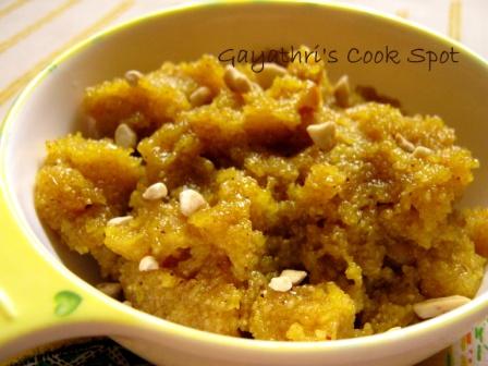 Oat Bran resembles rava/semolina. So I substituted rava with oat bran and prepared this delicious kesari. The texture remained the same. I had to use less water for this kesari. I prepared this as neivedhyam yesterday.