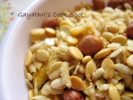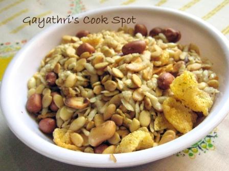 Mixture is a snack which consists of a mixture of two or more crispy ingredients. Usually mixture has deep fried ingredients. I tried to cut down oil and make it nutritious. I prepared this delicious mixture today. All the ingredients are roasted with a little oil(except the corn flakes). As pumpkin seeds are so nutritious, you can relish this mixture without guilt. I am sending this to CWS-Pumpkin Seeds started by Priya and guest hosted here this month.