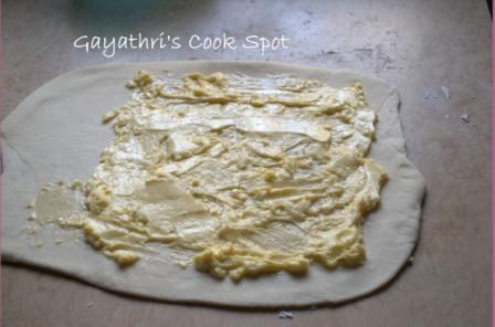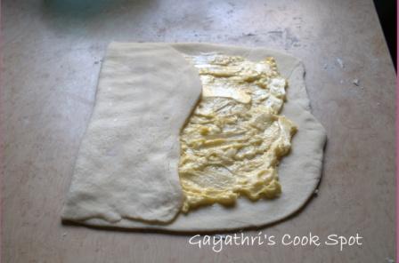 15. Apply butter on 2/3rd of the rectangle, leaving a border of 1.5″.