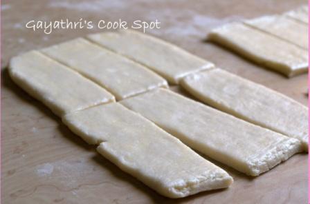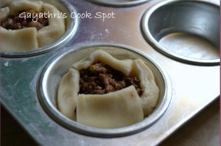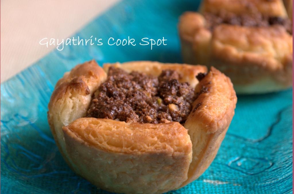 Procedure: 1. Take the stripe of laminated dough and roll it a little. Cut it into half each measuring 12cm*20cm. 2. Again cut each half into three 4 cm*20cm. 3. Now cut each stripe into two so that you have, 12 pieces of 10cm*4cm stripes. 4. Grease a muffin pan, and line 8 cups with 8 stripes. 5. Cut the remaining stripes into 4, so that you have 16 small rectangles. 6. Now arrange two rectangles on the side of one muffin cup, so that it resembles a cross. Press it well so that the edges stick together. 7. Repeat for the other cups. 8. Mix paneer, pistas and nutella. 9. Divide it among the 8 prepared cups. 10. Now bring the four edges together to make a cup like structure. 11. Repeat for other cups. 12. Cover and keep it aside for 1 hour. 13. Preheat oven to 200C. 14. Bake until golden. Cool on wire rack and serve.