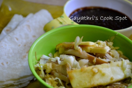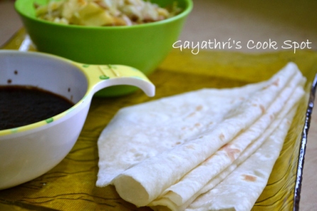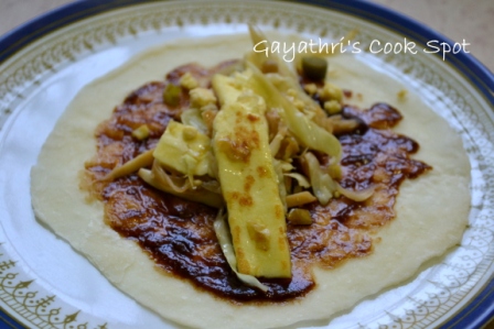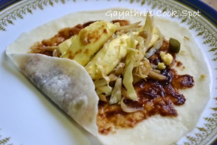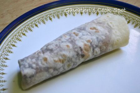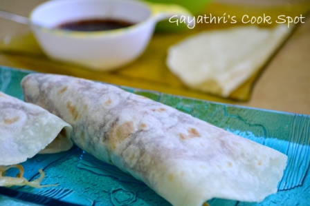 The pancake was so soft and Sruti liked it very much. She applied a lot of tomato ketchup and rolled it herself. The unknown ingredient in this dish was the bamboo shoot. Luckily, I got it in a store. But, we didn’t like the flavor of the bamboo shoot. So next time, I will avoid it while preparing the vegetables. As this was the first time, I applied a lot of hoisin sauce and my hubby didn’t like it. So for the next roll, I applied a little bit of the sauce and added a lot of tomato ketchup. He liked it a lot. As a whole the dish is nice and I will prepare it again omitting the bamboo shoot and hoisin sauce.