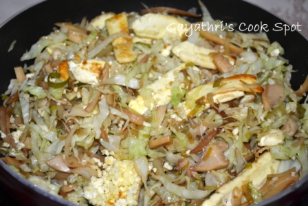 As I prepared a vegetarian version, I used Paneer instead of pork and crumbled paneer instead of scrambled eggs. I surely learnt about a dish which was unknown to me and I thank Shelly for that.