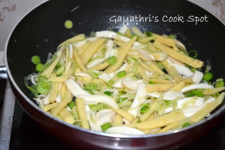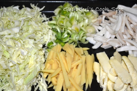 7. Heat the remaining oil, and add mushrooms. After a minute add the bamboo shoots and leeks.