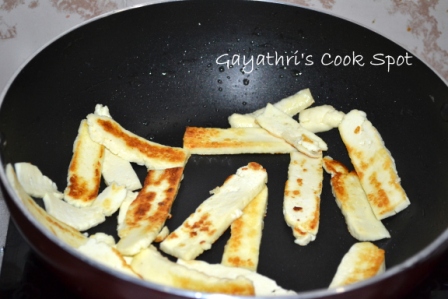 6. Take 1/2tsp oil in a pan and add the paneer pieces. When both the sides are golden, keep it aside.