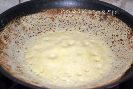 8. Heat a lightly greased pan (if using non stick, no need to grease it) and pour a ladle full of the batter. Swirl the pan, so that the batter coats the sides evenly. The sides should be thinly coated and the centre should have more batter so that the centre comes out spongy and the sides crispy.