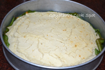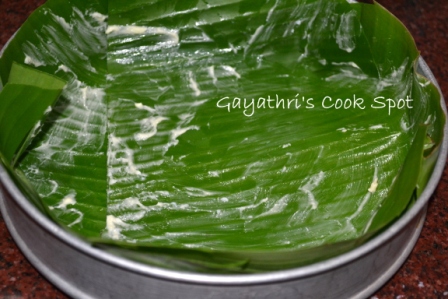 - 5. Line a round 8" cake tin with banana leaf and grease it with butter.