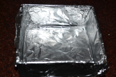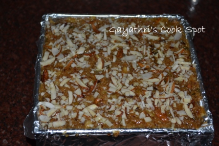 12. Line a tin with foil. Pour the mixture into the tin. Top it with sliced almonds, This step is not necessary if you are going to serve it in a bowl.