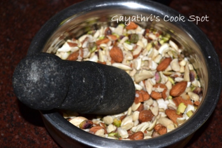 5. Add the crushed dry fruits and stir well. Stirring is very important. Otherwise you will get burnt smell in the majun. Do not leave the pan unattended.