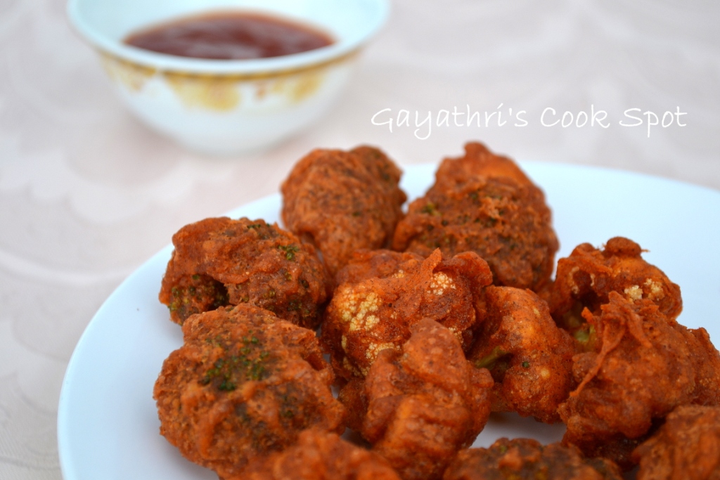 4. Dip the brocolli into the batter one by one and drop into hot oil.