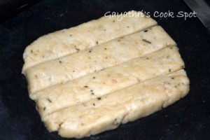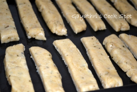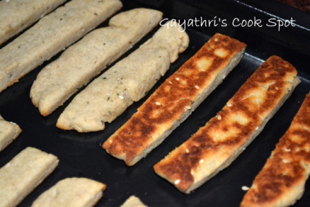 Procedure: 1. Mix all the dry ingredients. Add potato and mix it well. 2. Add the oil and knead to form a soft dough. 3. Divide into 5 equal parts. 4. Roll out each ball into a square of 11cm*9cm. 5. Cut them into 4 equal stripes each measuring 11cm*2 1/4cm. 5. Preheat oven to 200C. 6. Place the stripes on a greased tray. 7. Bake for 20minutes. In between rotate the tray once for even browning. The top will not change colour. 8. After 20minutes, flip the sticks so that the top goes to bottom for browning. 9. Bake for 10minutes. 10. Remove tray from oven and keep it aside for 5 minutes. 11. Serve crunchy sticks along with coffee or tea.